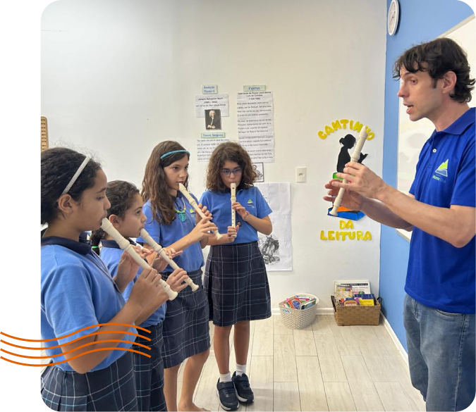 No Ensino Fundamental, o aprendizado musical é aprofundado por meio da prática de canto coral e do ensino de instrumentos musicais, proporcionando uma experiência mais completa e enriquecedora que desenvolve a sensibilidade, a coordenação e o gosto pela música.