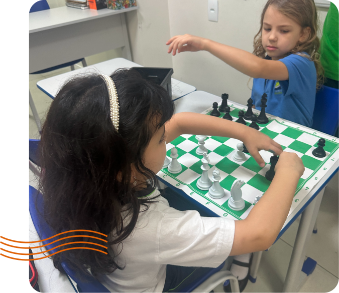 Oferecemos aulas semanais de xadrez para nossos alunos, proporcionando um espaço dedicado ao desenvolvimento do raciocínio lógico, da concentração e da tomada de decisões estratégicas. Por meio deste jogo milenar, estimulamos habilidades cognitivas importantes, além de promover a disciplina e o respeito às regras, contribuindo para a formação integral dos estudantes de maneira divertida e desafiadora.